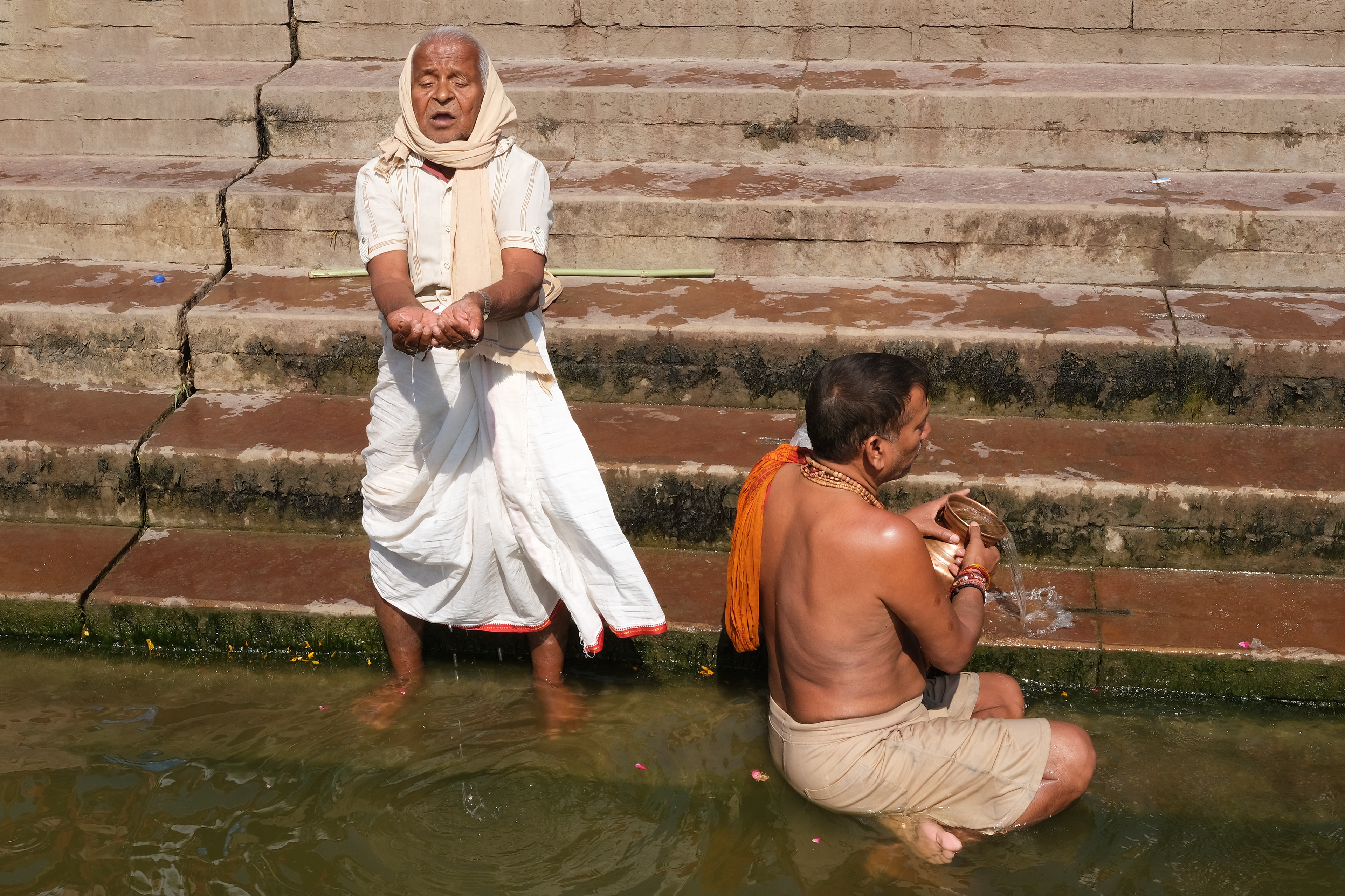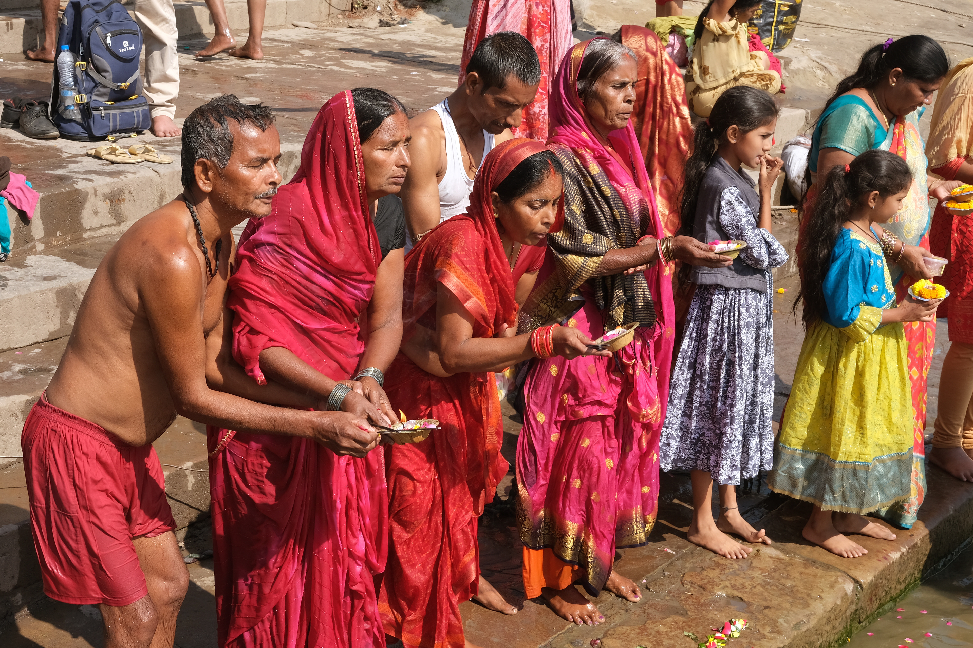 The Encounter of the Human and the Divine - In Varanasi, devotees immerse themselves in the Ganges to purify. Hands, faces, and bodies are bathed in the sacred waters, an act of faith to cleanse sins and break the cycle of reincarnation, reaching moksha, spiritual liberation. Amid the sound of the water and the chanting of mantras, the river becomes a bridge between the human and the divine.